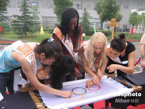 圖:世界休閑佳麗手串珍珠共制奧運五環(huán)旗(2)