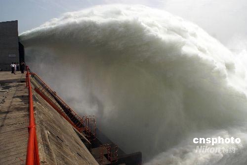 2008年6月23日,黃河小浪底水庫大流量下泄,再現(xiàn)飛瀑景觀。黃河第七次調(diào)水調(diào)沙2008年6月19日啟動以來,黃河小浪底水庫下泄流量逐步加大,通過小浪底水庫進行人為控制,以水沙相協(xié)調(diào),對下游河道進行沖刷,最終達到減少下游河道淤積的目的。中新社發(fā) 平白 攝