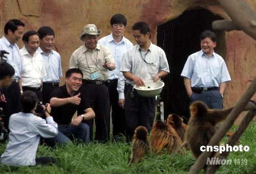 臺(tái)北市長郝龍斌在上海野生動(dòng)物園與金絲猴近距離接觸。
