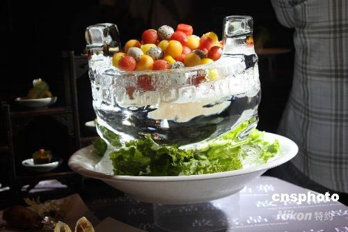 主廚仿照西周晚期的“毛公鼎”造型制作成冰雕,晶亮剔透的“鼎”中 ,盛裝著臺灣的特產水果,給人視覺與味覺的驚喜。中新社發(fā) 耿軍 攝