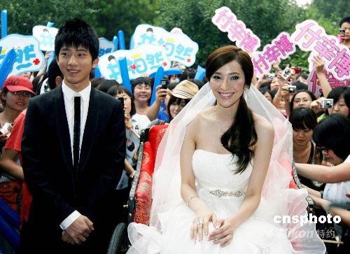6月25日,北京,吳佩慈簽約星光國際傳媒集團(tuán)。華誼兄弟、星光國際各自帶來了自己的最強(qiáng)陣容,簽約儀式被布置成婚禮的形式,“男才女貌”組合袁成杰、戚薇是當(dāng)天的司儀,BOBO組合代表娘家人作為出嫁伴童,“征婚人”則是蘇有朋。嘉賓紛紛帶來自己的禮物,“男才女貌”組合更是送上擁抱、香吻。中新社發(fā) 袁方 攝