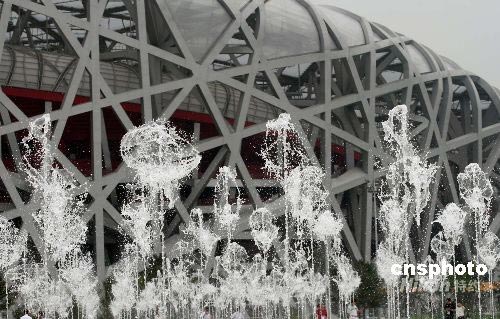 6月28日,北京奧運(yùn)會(huì)主體育場(chǎng)國(guó)家體育場(chǎng)(“鳥巢”)落成典禮在北京舉行,“鳥巢”與廣場(chǎng)上的音樂噴泉相映成趣。中新社發(fā) 盛佳鵬 攝