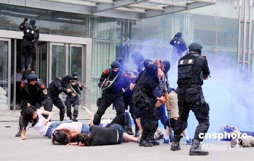 6月30日,山東省反恐怖工作協調小組在濟南成功舉行了“泰山2008”反恐演習!疤┥2008”反恐演習以北京奧運會期間可能發(fā)生的恐怖襲擊事件為背景,以有效防范和正確處置為課題,主要目的是檢驗和提升山東省城市防范處置恐怖襲擊事件的應急反應能力、組織指揮能力和綜合保障能力。這次演習是山東省第一次公安各警種與武警、衛(wèi)生、市政等反恐應急力量協同作戰(zhàn)的合成演習,是第一次以導調推演方式進行的檢驗性演習,也是第一次通過全省公安視音頻系統同步傳輸的反恐演習。中新社發(fā) 陳 進 攝