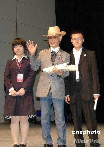 八十九歲高齡的日本漫畫家協(xié)會(huì)理事長(zhǎng)柳瀨 嵩向來(lái)自南山中學(xué)的學(xué)生代表勾梁丁、蘇思宇同學(xué)表達(dá)深切的問(wèn)候,并接受了兩位同學(xué)的禮物--南山中學(xué)的畫冊(cè)。中新社發(fā) 朱沿華 攝