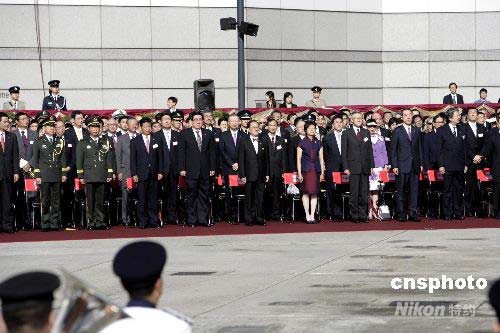 香港特區(qū)行政長官曾蔭權及特區(qū)政府官員、中央駐港聯(lián)絡辦公室、外交部駐港特派員公署、駐港部隊及眾多民眾參加升旗儀式。中新社發(fā) 王麗南 攝