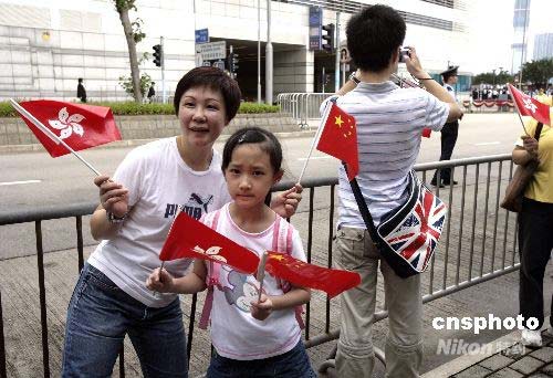 出席升旗儀式的香港市民拍照留念。中新社發(fā) 王麗南 攝