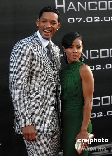 圖為《全民超人》男主角漢考克的扮演者好萊塢著名影星威爾·史密斯(Will Smith)與妻子賈達(dá)·萍克·史密斯一起出席首映禮。中新社發(fā) 張煒 攝