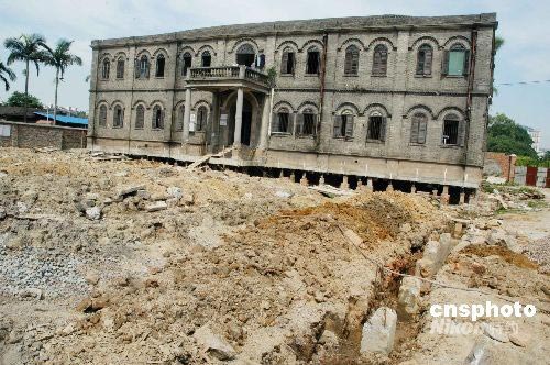 2008年7月3日,福州老洋房泛船浦教堂神父樓在上百個(gè)千斤頂?shù)闹蜗码x地1米,準(zhǔn)備整體平移。這棟老洋房由于位于建設(shè)規(guī)劃范圍內(nèi),經(jīng)過(guò)一年多準(zhǔn)備,福州市有關(guān)部門決定對(duì)泛船浦教堂神父樓實(shí)施整體平移,以利于文物保護(hù)和減少經(jīng)濟(jì)損失。這幢樓將先往東平移75.6米,再整體旋轉(zhuǎn)90度向南平移30.7米,由東西朝向變?yōu)槟媳背。該教堂建?932年秋,1933年9月落成,耗資17萬(wàn)銀元,建筑風(fēng)格屬半哥特式、半法國(guó)式。中新社發(fā) 張 斌 攝