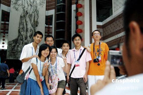 7月7日下午,參加海峽西岸2008年臺(tái)胞青年夏令營的110多名臺(tái)胞青年來到位于古城泉州的中國閩臺(tái)緣博物館。圖為臺(tái)灣青年在閩臺(tái)緣鎮(zhèn)館之寶《同文同種同根生》世界面積最大火藥壁畫前合影留念。 中新社發(fā) 傅丹丹 攝