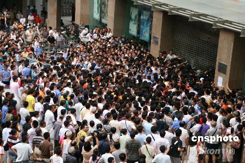 10元面值的可等值流通貨幣北京奧運(yùn)紀(jì)念鈔迅速在民間刮起了一股收藏旋風(fēng),掀起了全民收藏?zé)崆椤?月9日,面值10元的奧運(yùn)紀(jì)念紙幣在南京的8家定點(diǎn)銀行發(fā)行。位于三元巷的一家定點(diǎn)銀行門(mén)前聚集了數(shù)百市民,現(xiàn)場(chǎng)有數(shù)十警察維持秩序。中新社發(fā) 彭增權(quán) 攝