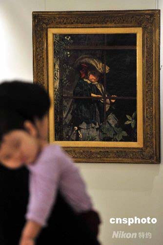倫敦蘇富比將于年底舉行英國藝術(shù)拍賣,并在拍賣前于世界各地舉行巡回展覽。七月十四日,香港蘇富比舉行拍賣傳媒預(yù)展。圖為《今天不能散步》(作者:蘇菲安迪信)估價約九百萬至一千二百萬港元。作品描繪小女孩整裝待發(fā),準(zhǔn)備外出散步,卻見雨點灑在玻璃屏上;陽光雖親吻小孩的臉龐,卻不掩其若有所失之態(tài)。中新社發(fā) 譚達(dá)明 攝
