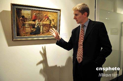 圖為《基督在家中》(作者:萊百克所羅曼及約翰米萊)估價約六百萬至九百萬港元。畫中主人翁為耶穌基督,他手掌因工受傷,血滴于腳背,圣母隨即上前安撫。中新社發(fā) 譚達明 攝