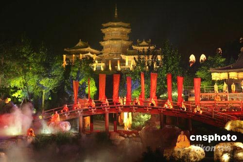 7月14日晚,一部名為《禪宗少林》的音樂(lè)大典在河南登封的嵩山實(shí)景演出,參加演出的演員達(dá)600人!抖U宗少林》由著名音樂(lè)家譚盾擔(dān)任藝術(shù)總監(jiān)和音樂(lè)原創(chuàng),梅帥元任導(dǎo)演。演出地點(diǎn)位于距嵩山少林寺7公里處的一片峽谷中,分為《水樂(lè)》《木樂(lè)》《風(fēng)樂(lè)》《光樂(lè)》《石樂(lè)》五個(gè)樂(lè)章,吸引眾多游客觀(guān)看。該節(jié)目將成為中原文化旅游的一大亮點(diǎn)。中新社發(fā) 趙雋 攝