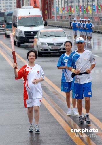 7月15日下午,奧運火炬在吉林市傳遞,已經懷孕7個月的火炬手李圓傳遞火炬。 中新社發(fā) 廖攀 攝