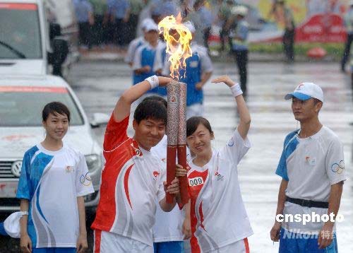 圖:奧運(yùn)火炬延吉傳遞 火炬手做出愛心造型