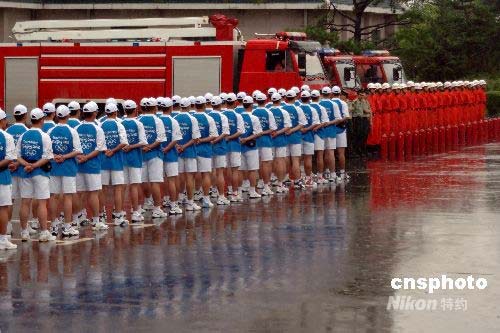 7月16日下午,奧運(yùn)火炬在吉林延吉傳遞,消防隊員和火炬護(hù)跑手整齊列隊等待出發(fā)。 中新社發(fā) 廖攀 攝
