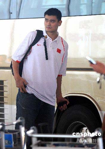 7月16日,中國男籃的“擎天拄”姚明隨同全隊抵達杭州參加2008斯坦科維奇洲際杯籃球賽。中新社發(fā) 任晨鳴 攝