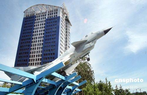 2008年7月17日,殲十飛機景觀工程在中國航空工業(yè)第一集團公司總部前“一航花園”隆重揭幕。這標(biāo)志著殲十飛機景觀工程正式落戶朝陽CBD。這架殲十是完全根據(jù)真機的一比一高仿模型,機上細(xì)節(jié)分毫畢現(xiàn)。殲十作出大仰角爬升的姿態(tài),翼下掛有國產(chǎn)雷石6滑翔制導(dǎo)炸彈、霹靂9C近距格斗空空導(dǎo)彈及霹靂12中距空空導(dǎo)彈。中新社發(fā) 博芽影像 攝