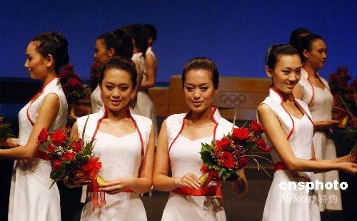 北京奧運(yùn)會(huì)頒獎(jiǎng)儀式志愿者雙胞胎姐妹李曉曄、李子曄在北京展示奧運(yùn)頒獎(jiǎng)鮮花。中新社發(fā) 王東明 攝