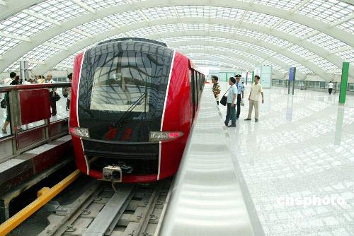 圖:北京地鐵機(jī)場專線駛?cè)胧锥紮C(jī)場T3航站樓