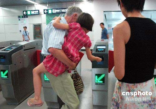 圖為在機(jī)場(chǎng)線三元橋車(chē)站入口處,外國(guó)游客一家人正在投票進(jìn)站。中新社發(fā) 張雙雙 攝