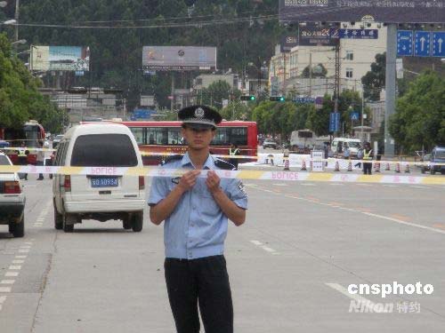 7月21日上午昆明市發(fā)生的巴士連環(huán)爆炸事件導(dǎo)致二人死亡十四人受傷,據(jù)介紹,事發(fā)車輛隸屬于昆明公交五公司,事發(fā)后五公司停止了所有公交車輛的運行,對車場內(nèi)所有車輛進(jìn)行了細(xì)致的檢查,在對事故車輛進(jìn)行檢查時發(fā)現(xiàn),引發(fā)爆炸的物品初步懷疑為雷管狀的可疑物。圖為21日下午,公交爆炸事件車輛所屬公司逐步恢復(fù)營運。圖為21日下午,警方仍對公交爆炸事件中的事件岷山現(xiàn)場進(jìn)行封鎖。中新社發(fā) 蔣晨 攝