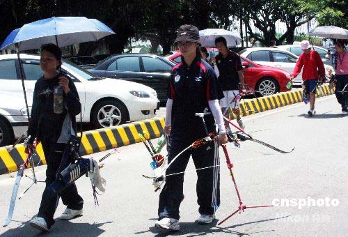 圖為中午,射箭運動員們正結(jié)束訓(xùn)練,返回休息。中新社發(fā) 黃少華 攝