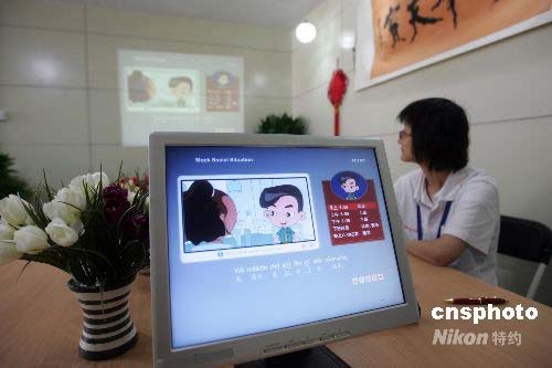 7月25日,北京奧組委奧運(yùn)村部副部長(zhǎng)、奧運(yùn)村新聞發(fā)言人鄧亞萍在上午舉行的“奧運(yùn)村即將開(kāi)村”新聞發(fā)布會(huì)上表示:奧運(yùn)村不僅為村民們準(zhǔn)備了豐富多彩的文化活動(dòng),在國(guó)際區(qū)還專設(shè)了中文學(xué)習(xí)中心,擁有多年對(duì)外漢語(yǔ)教學(xué)經(jīng)驗(yàn)的老師,可以在短時(shí)間內(nèi)教會(huì)運(yùn)動(dòng)員一些簡(jiǎn)單的生活漢語(yǔ)。村民還可以在這里起一個(gè)好聽(tīng)的中文名字,同時(shí)還可以學(xué)習(xí)簡(jiǎn)單的中國(guó)書(shū)法。圖為奧運(yùn)村里的中文學(xué)習(xí)室。中新社發(fā) 杜洋 攝