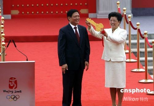 7月27日,北京奧運(yùn)村開村。北京市委書記、北京奧組委執(zhí)行主席劉淇向奧運(yùn)村村長、北京奧組委副主席陳至立移交奧運(yùn)村鑰匙。中新社發(fā) 杜洋 攝