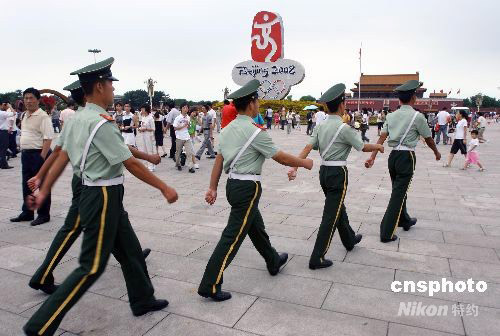 7月29日,一隊(duì)執(zhí)勤武警士兵從天安門廣場(chǎng)“中國(guó)印·舞動(dòng)的北京”主體花壇旁巡邏經(jīng)過。天安門廣場(chǎng)“奧運(yùn)”花壇整體工程進(jìn)入尾聲,奧運(yùn)氣氛更濃,市民與游客紛紛至此游玩拍照,安全保衛(wèi)工作也加強(qiáng),以確!捌桨矈W運(yùn)”。 中新社發(fā) 劉新 攝