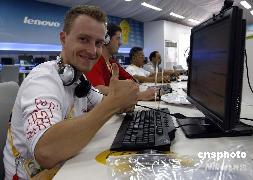 7月29日,一名在北京奧運(yùn)村網(wǎng)吧上網(wǎng)的外國(guó)運(yùn)動(dòng)員,豎起大拇指贊揚(yáng)這里的設(shè)施和服務(wù)。奧運(yùn)村網(wǎng)吧從早上8 點(diǎn)開(kāi)始開(kāi)放至午夜12點(diǎn),所有居住在奧運(yùn)村中的運(yùn)動(dòng)員、教練員和官員,均可憑有效證件進(jìn)入網(wǎng)吧免費(fèi)享受上網(wǎng)服務(wù)。 中新社發(fā) 杜洋 攝
