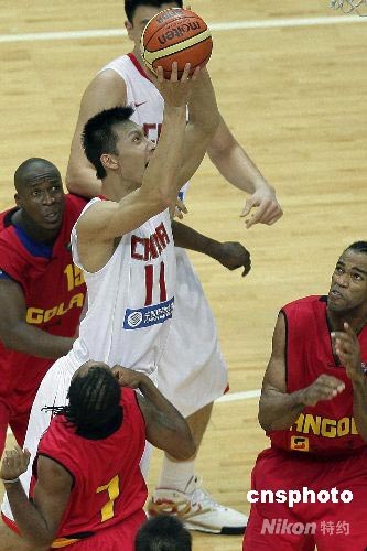 7月29日晚,國(guó)際籃聯(lián)2008鉆石杯男籃比賽中國(guó)隊(duì)與安哥拉隊(duì)的比賽在江蘇南京奧體中心體育館舉行。最終中國(guó)隊(duì)83比74戰(zhàn)勝安哥拉隊(duì),取得開(kāi)門(mén)紅并報(bào)了斯坦科維奇杯輸球的一箭之仇。參加鉆石杯男籃比賽的隊(duì)伍包括阿根廷隊(duì)、澳大利亞隊(duì)、塞爾維亞隊(duì)、安哥拉隊(duì)、伊朗隊(duì)和東道主中國(guó)隊(duì)。這次比賽也是北京奧運(yùn)會(huì)前各隊(duì)的最后一次熱身機(jī)會(huì)。圖為中國(guó)隊(duì)11號(hào)隊(duì)員易建聯(lián)進(jìn)攻。 中新社發(fā) 盛佳鵬 攝