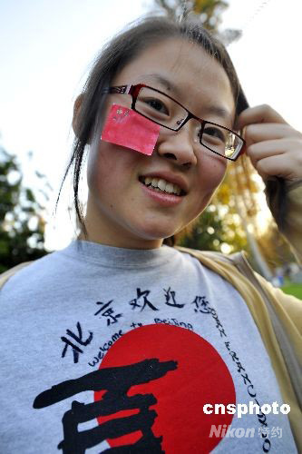 圖為剛到美國2年的高一女生自己制作了國旗貼紙和“北京歡迎你”字樣的T恤衫觀看北京奧運(yùn)開幕式轉(zhuǎn)播。中新社發(fā) 陳鋼 攝