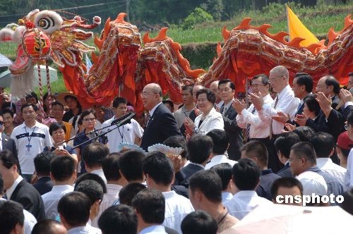 中國國民黨主席吳伯雄回到福建永定縣下洋鎮(zhèn)思賢村謁祖,受到家鄉(xiāng)父老的歡迎。中新社發(fā) 鄭祚聲 攝