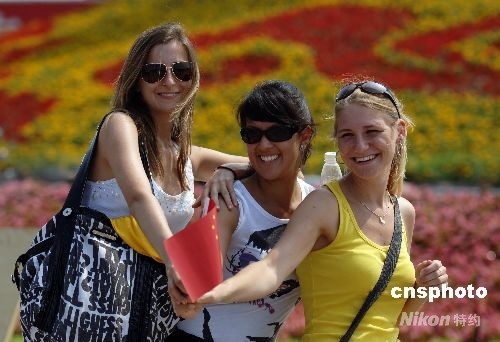 8月18日,北京晴空萬里,三位外國(guó)靚女在天安門廣場(chǎng)留影。中新社發(fā) 王東明 攝