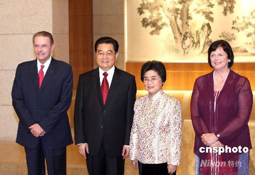 胡錦濤夫婦歡迎出席奧運(yùn)會(huì)閉幕式的羅格夫婦