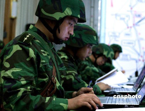 中國人民解放軍“勵兵--2008”演練8月26日拉開帷幕。當日上午濟南軍區(qū)某機械化步兵旅指揮機關(guān)向所屬部隊下達了進入戰(zhàn)備狀態(tài)命令,部隊迅速進入戰(zhàn)位嚴整以待,戰(zhàn)備狀態(tài)將隨時升級。中新社發(fā) 宋吉河 攝