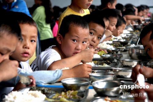 9月1日,四川阿壩州汶川地震災區(qū)的600余名學生在瀘州市第十中學校經過兩周的環(huán)境適應后,正式進入過渡復課,圖為孩子們正在集體用餐,三菜一湯,吃得津津有味。中新社發(fā) 牟科 攝