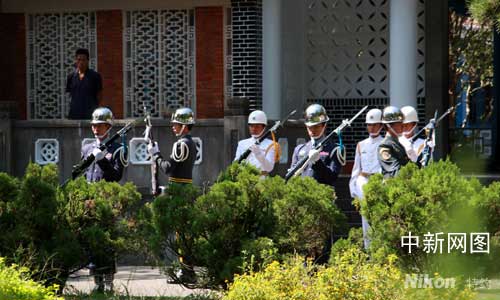 9月7日,臺灣慈湖兩蔣文化園區(qū)中儀仗隊(duì)正在蔣介石陵寢大門前表演節(jié)目。曾福志 攝影