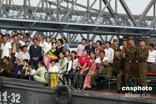 9月9日正值朝鮮國慶,朝鮮新義洲民眾有組織地乘船游覽鴨綠江。身著節(jié)日服裝的朝鮮民眾站在船上眺望一江之隔的中國丹東,并向中國民眾招手致意。中新社發(fā) 陳浩浩 攝