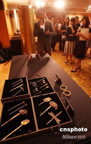 九月十日,香港國際藝展公司向傳媒展示一套華美精巧的黃金發(fā)飾,估計拍賣價在八百萬港元。該公司主辦的 “2008香港國際古玩及藝術(shù)品博覽會”將在十月四日至七日在會展中心舉行。中新社發(fā) 洪少葵 攝