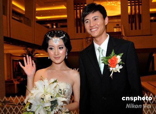 2008年9月19日,2008北京奧運(yùn)會(huì)男子佩劍冠軍仲滿的婚禮在南京紫金山莊舉行。江蘇省體育局局長殷寶林、奧運(yùn)冠軍陳若琳、吳靜鈺、邱健等眾多好友出席了婚禮,為新人送上祝福。中新社發(fā) 劉建民 攝