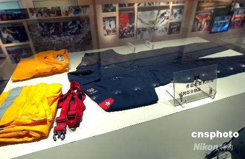 中國汶川大地震救災(zāi)工作中,香港抗震救災(zāi)救援隊(duì)隊(duì)員穿過的救災(zāi)服裝在展會柜臺中展出。