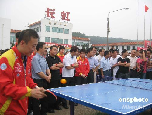 9月20日,中國體育總局乒羽中心主任劉鳳巖、男乒主教練劉國梁、女乒主教練施之皓、隊員張怡寧、馬琳、王皓、王勵勤等一行15人帶著奧運(yùn)金牌、榮譽(yù)、喜悅和祝福,前往四川綿陽長虹培訓(xùn)中心看望慰問在汶川大地震中遭受重創(chuàng)的北川中學(xué)學(xué)生。圖為馬琳等隊員與學(xué)生們切磋球技。中新社發(fā) 肖青 攝