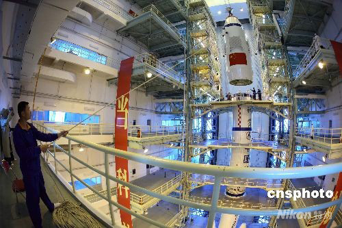 備受矚目的神舟七號載人航天飛行任務實施在即,目前,飛船、火箭、逃逸塔已在酒泉衛(wèi)星發(fā)射中心總裝測試廠房順利完成對接。中新社發(fā) 楊志遠 攝