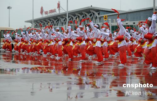 9月22日上午,以中共中央政治局常委、中央紀(jì)委書記賀國(guó)強(qiáng)為團(tuán)長(zhǎng)的中央代表團(tuán),乘專機(jī)抵達(dá)銀川河?xùn)|機(jī)場(chǎng),受到寧夏回族自治區(qū)官員和民眾的熱烈歡迎。圖為寧夏回族青年舞動(dòng)腰鼓歡迎中央代表團(tuán)抵達(dá)銀川。中新社發(fā) 廖攀 攝