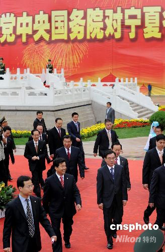 9月22日,中共中央政治局常委、中央紀(jì)委書記、中央代表團(tuán)團(tuán)長賀國強(qiáng)等,在銀川出席中央政府向?qū)幭幕刈遄灾螀^(qū)贈送民族團(tuán)結(jié)寶鼎儀式。當(dāng)日上午,以賀國強(qiáng)為團(tuán)長的中央代表團(tuán)乘專機(jī)抵達(dá)銀川,參加寧夏回族自治區(qū)成立50周年慶;顒印V行律绨l(fā) 廖攀 攝