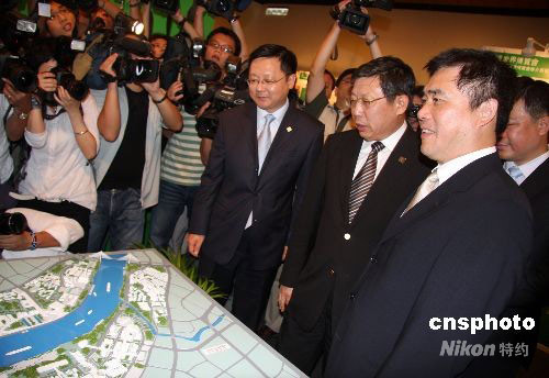 9月22日,“2010上海世界博覽會(huì)推介會(huì)”暨“走進(jìn)世界博覽會(huì)”展覽活動(dòng)在臺(tái)北開(kāi)幕。出席開(kāi)幕式的臺(tái)北市市長(zhǎng)郝龍斌(右一)、上海常務(wù)副市長(zhǎng)楊雄(右二)一起參觀上海世博會(huì)整體規(guī)劃展覽。中新社發(fā) 陳立宇 攝