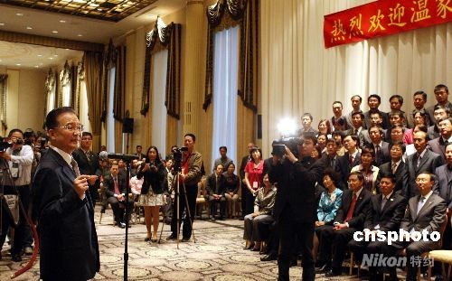 9月23日下午,抵達(dá)紐約的中國(guó)總理溫家寶與當(dāng)?shù)厝A人華僑、中國(guó)駐外機(jī)構(gòu)代表和留學(xué)生等見面。中新社發(fā) 李靜 攝