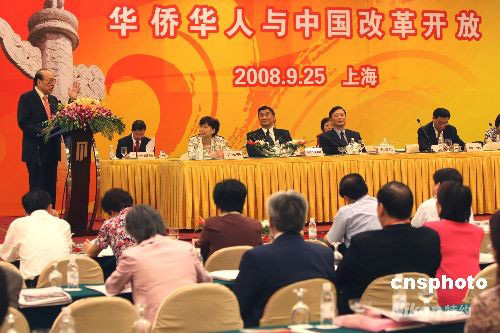 9月25日,中國僑聯(lián)主辦的“華僑華人與中國改革開放紀(jì)念大會(huì)”在上海舉行,來自20多個(gè)國家和地區(qū)的300余名僑領(lǐng)、華商共聚一堂,圍繞“華僑華人與中國改革開放”主題,共敘中國改革開放30年取得的偉大成果。中新社發(fā) 史利 攝